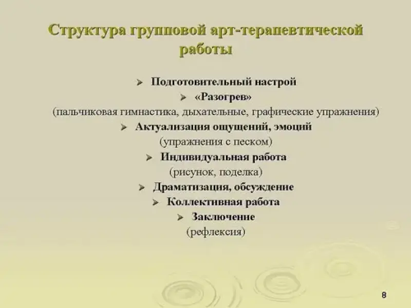 Исходя из представлений А.И. Копытина [18, с.184] и Л.Д. Лебедевой [19] об этапах групповых занятий, мы предлагаем следующую структуру групповой арт-терапевтической работы.