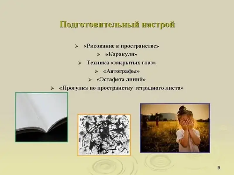 Каждое занятие начинается с подготовки детей к спонтанной, художественной деятельности. Для этого используются различные игры, двигательные и танцевальные упражнения, несложные изобразительные приемы. Например, Л.Д. Лебедева предлагает различные варианты техники "Каракули" ("каракули Винникотта", "каракули тела"), техника "закрытых глаз", "автографы", "эстафета линий", позволяющие снизить контроль со стороны сознания в процессе рисования (Д.Винникотг, Ф.Кейн, М.Ричардсон, Э.Ульман и др.) [19, с.80-81]. При рисовании с закрытыми глазами, ребенок способен лучше настроиться на свои переживания, мысли, внутренний мир. Отмечая данную особенность непроизвольных рисунков, Г.Фурт даже назвал их молитвой своему внутреннему "Я" [4, с.186].