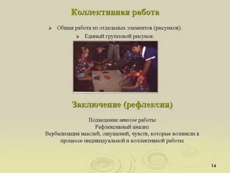 Заключительный, седьмой этап, предполагает подведение итогов работы, рефлексивный анализ, вербализацию мыслей, ощущений, чувств, которые возникли в процессе индивидуальной и коллективной работы. Всем желающим ребятам дается возможность выступить, рассказать, интерпретировать свою работу, дополнить, "подправить" и объяснить то, что не удалось изобразить. При этом реализуется потребность быть понятым и принятым группой. Завершая занятие, важно подчеркивать успех каждого и всей группы, в целом.