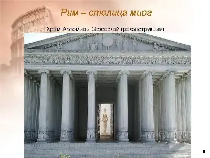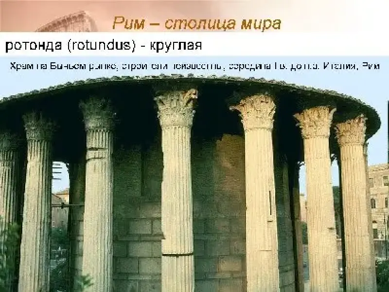 Следующее, явное нововведение римлян это применение ротонды - типа круглого храма. (Учащиеся работают с тетрадью, а учитель открывает 3 термин. Слайд 8) И вообще, их явно тянуло к круглой форме. Посмотрите на 78 странице учебника - храм Весты.