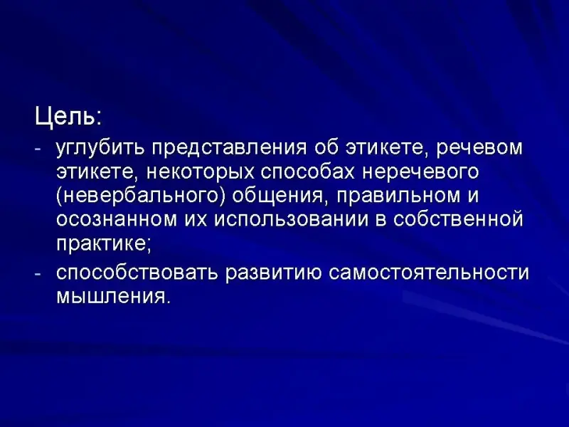 Преподаватель: цель нашего урока - углубить имеющиеся у вас представления об этикете, речевом этикете, некоторых способах неречевой передачи информации, а также способствовать правильному и осознанному их использованию в практике общения и развитию самостоятельности мышления.