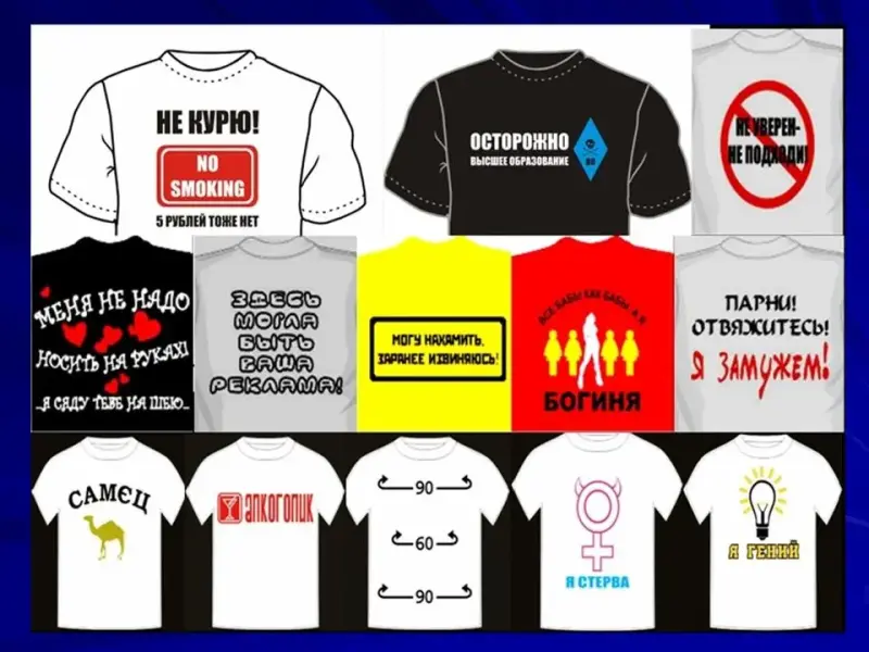 Оказывается сейчас в моде "говорящая" одежда. Разумеется, меня заинтересовало это понятие и я обратилась к интернету. (На мультимедийном экране слайд, иллюстрирующие "говорящую" одежду).