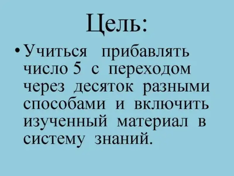Цель:. Сформировать у учащихся разные приемы прибавления числа 5 с переходом через десяток и включить изученный материал в систему знаний.
