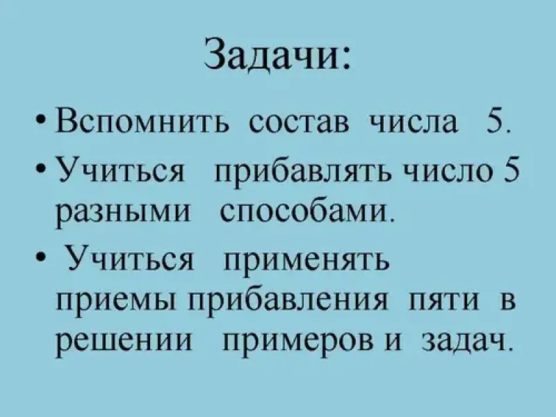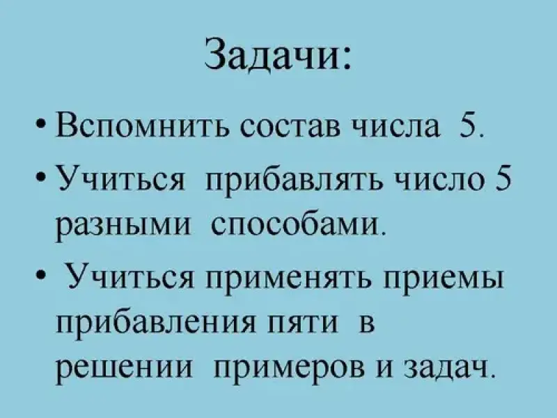 - Актуализировать умение прибавлять разными приемами число 5, состав числа 5. Моделирование прибавления числа 5.