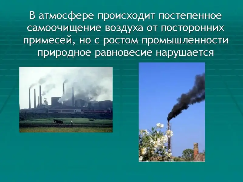 В атмосфере происходит постепенное самоочищение воздуха от посторонних примесей, но с ростом промышленности природное равновесие нарушатся. (слайд 6)