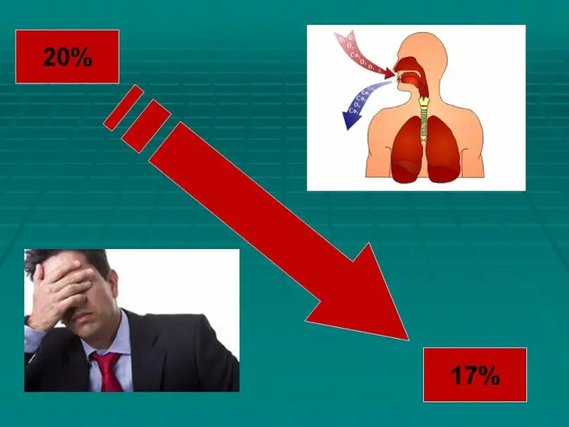 Физиологические сдвиги в организме человека происходят уже тогда, когда содержание кислорода снижается с 20 до 17%.