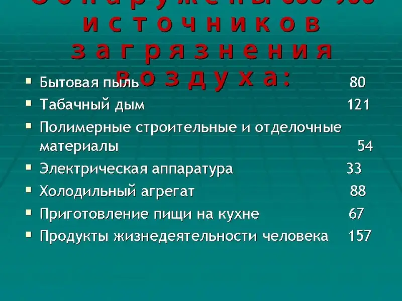 Ведущий: К источникам загрязнения воздушной среды закрытого помещения относятся строительные и отделочные материалы.