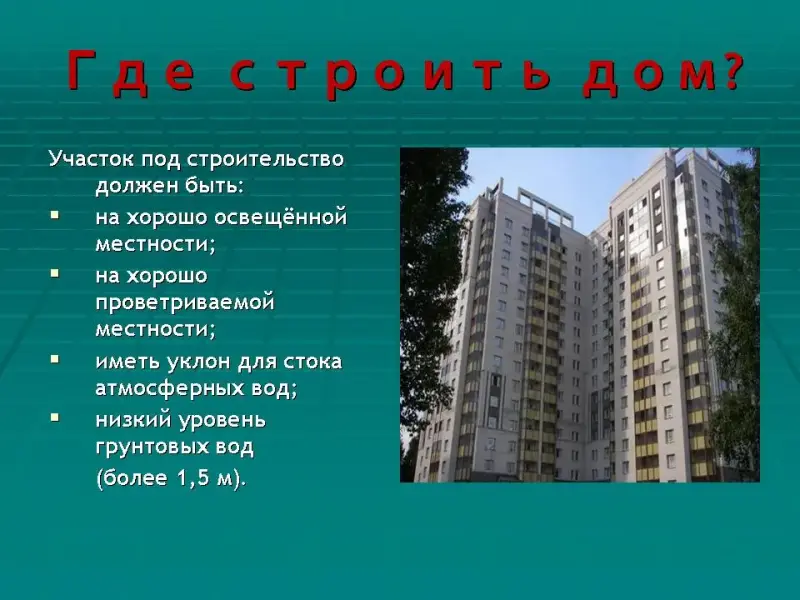 Студент 3: Качество жилища закладывается задолго до его строительства. Участок под строительство следует выбирать на хорошо освещенной солнцем и проветриваемой местности. Он должен иметь уклон для стока атмосферных вод и низкий уровень грунтовых вод. (слайд 15)