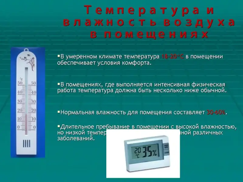 Нормальная влажность для жилых помещений составляет 30-60%. Длительное пребывание в помещении с высокой влажностью и низкой температурой может привести к ревматизму, простудам и обострениям хронических заболеваний.