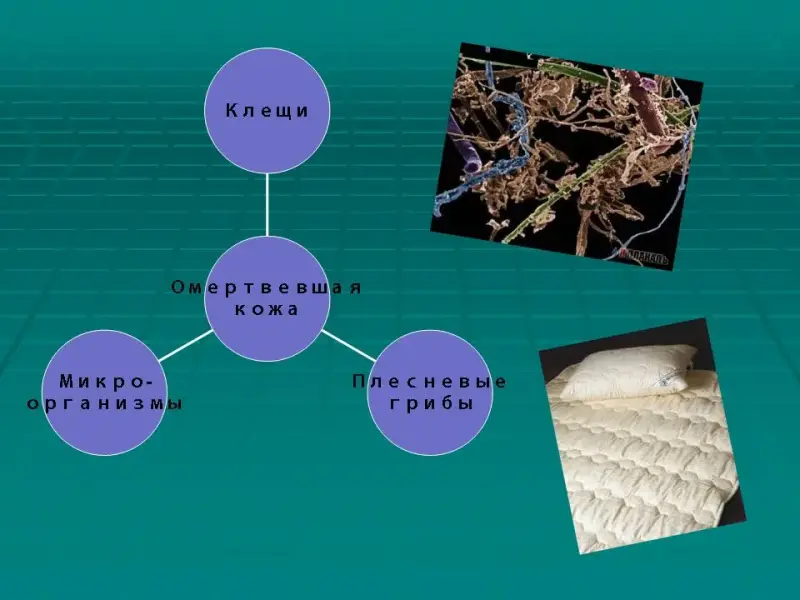 Особенно благоприятные условия создаются для них в постели - тепло, влажно и обилие пищи. В одном матрасе может проживать до 200000 клещей! Фекальные шарики клещей, размером не более 30 микрон (микрон - одна тысячная часть миллиметра) легко заполняют объем помещения при уборке и попадают в дыхательные пути. (слайд 25)