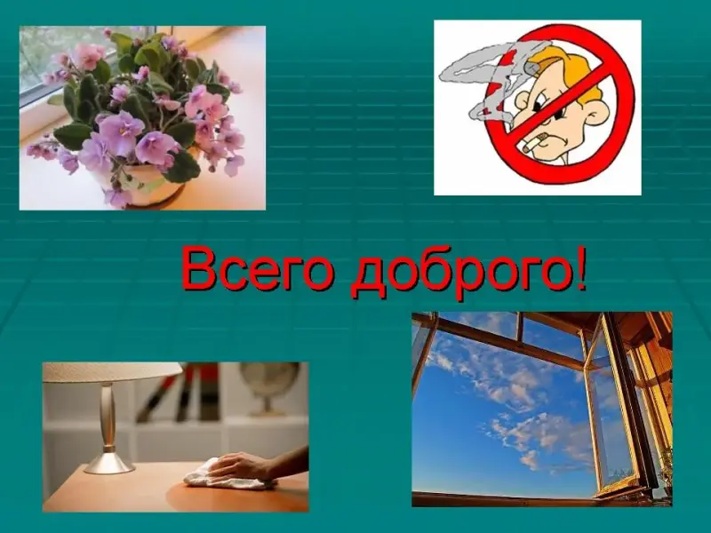 Ведущий: Итак, мы многое узнали об экологии нашего дома. Хочется надеяться, что теперь мы все будем следить за её качеством. Будем разводить цветы для очищения воздуха, будем регулярно делать влажную уборку и проветривать комнаты, не будем курить и много времени проводить за компьютером и телевизором! (слайд 29)