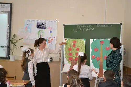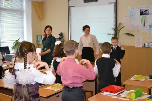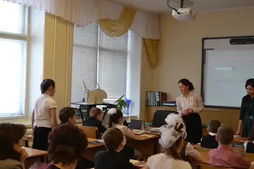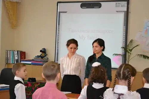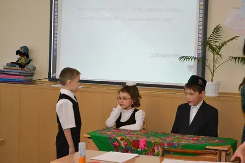 T.: Boys and girls, you have a wonderful opportunity to learn two languages at our gymnasium. Today we will try it. We will speak two languages: England and Tatar. I think it is not easy. And that's why first of all we have to train our tongues.