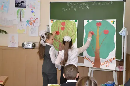 T.: Boys and girl, we need two volunteers to make our genealogical trees. You can see these small apples on the table, choose and put them on our family trees in the correct order. Then we'll check your work.