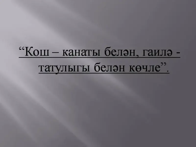 а) У-чы: (4 слайд) Татар халык мәкалендә әйтелгән: "Кош -канаты белән, гаилә татулыгы белән көчле". Гаиләдә безнең өчен бик якын һәм кадерле кешеләр бар. Кемнәр алар? (Әти, әни). Дөрес, әти-әни-иң якын кешеләр. "Әткәм- шикәр, әнкәм-бал"-дигән татар халкы.