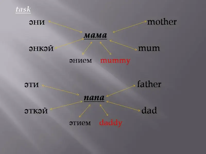 T.: Tell us how these words will be in English. (Mum, dad)
