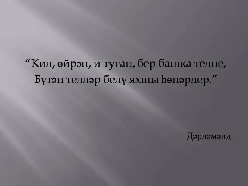 Бүтән телләр белү яхшы һөнәрдер" - дигән язучы Дәрдмәнд. Балалар, сез инде күрсәттегез инглиз теле белән кызыксынуыгызны. Рус телен дә яхшы беләсез. Тик безнең туган телебез-татар теле. (9 слайд) "Иң татлы тел-туган тел, анам сөйләп торган тел" - дигән халык. Туган тел-иң татлы, иң газиз тел ул. Бу телдә безнең әти-әниләребез, әби-бабаларыбыз сөйләшә. Әби-әниләребез безгә бишектә чагында ук туган телдә җырлар җырлаганнар. Без туган тел белән сокланабыз, чөнки ул-бөек Тукайлар һәм Җәлилләр теле.
