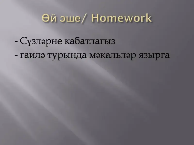 У-чы: Без Регина Марсовна белән бер нәтиҗәгә килдек һәм сезнең тулы җавапларыгыз, матур рәсемнәрегез өчен, гаиләгез һәм дусларыгыз турында кызыклы мәгүлүмат биргәнегез өчен һәм дәрестә актив катнашканыгыз өчен барыгызга да уңай билгеләр куйдык. (12 слайд) Ә инде хәзер көндәлекләрегезне ачыгыз һәм өй эшен язып куегыз: гаилә әгъзәләрен кабатлагыз һәм гаилә турында мәкальләр язып килегез. Дәрестә актив катнашкан укучылырга рәхмәт, дәрес тәмам, саубулыгыз!
