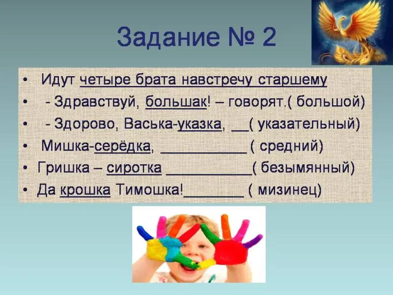 - Здорово, Васька-указка, (указательный)
