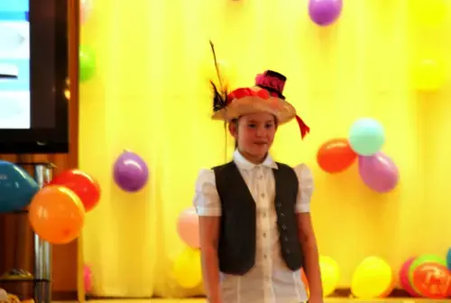 По центру сцены большая шляпа с огромными полями, на них название программы «Все дело в шляпе». Все учащиеся 4-ых классов - в костюмах и шляпах.