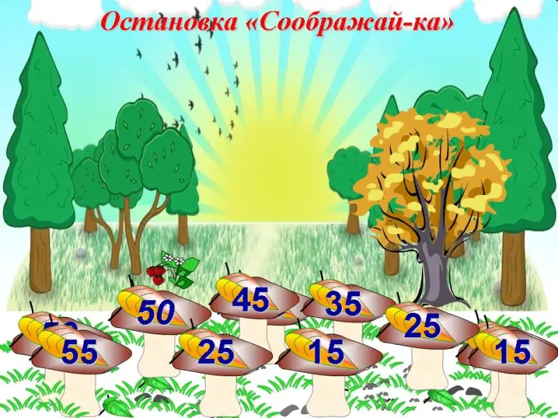 - На поляне растут математические грибы. Эти грибочки необычные они волшебные. Посмотрите, какие числа записаны на шляпках грибов, поставьте их в порядке убывания (уменьшения) и вы узнаете, какое слово спряталось на грибочках. (Приложение 2) Ответ: 55, 50, 45, 35, 25, 15.