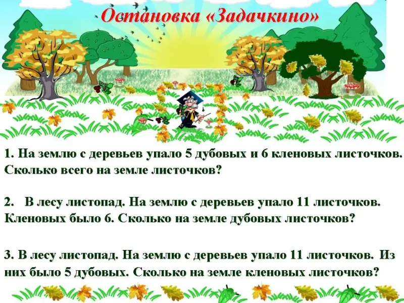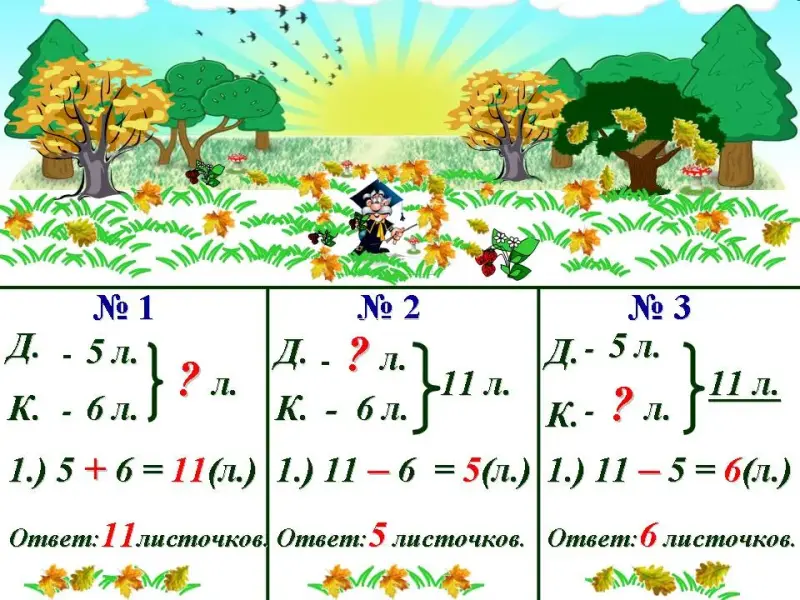 5 дубовых листочков и нужно узнать, сколько всего упало на землю листочков с двух деревьев, во второй задаче известна общее количество листочков и нужно узнать, сколько на земле дубовых листочков.)