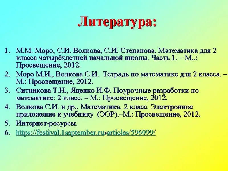 4. Волкова С.И. и др.. Математика. 2 класс. Электронное приложение к учебнику (ЭОР). - М.: Просвещение, 2012.