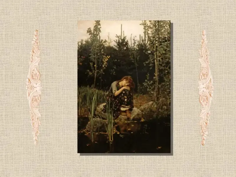листья, как бабочки. Печальные глазки, склонённая к коленям голова. Алёнушка печальную думу думает…»