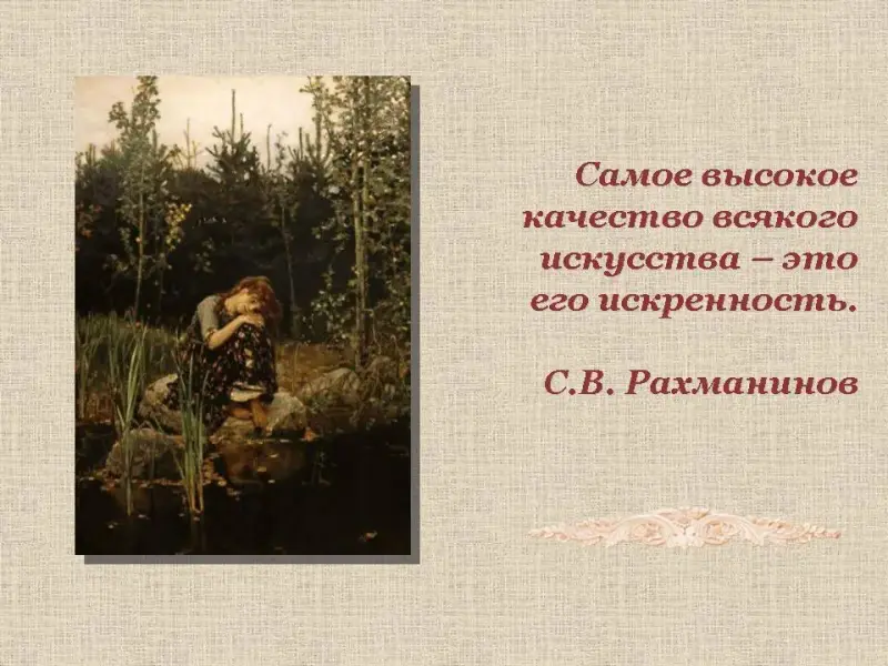 - Глубокому восприятию произведений искусства, осознанию и переживанию их тематики способствуют музыка и поэзия. Внимательно следите за тем, что сейчас будет происходить на экране, вслушивайтесь в чарующие звуки музыки.