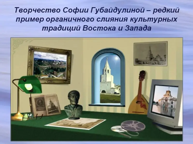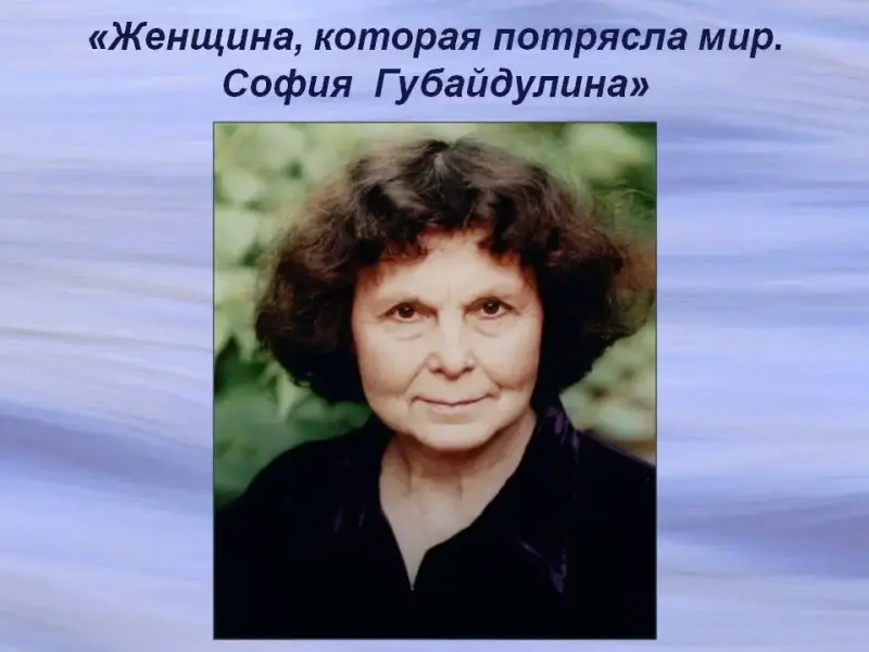 Прозвучавшая музыка - Концерт для двух оркестров, эстрадного и симфонического - принадлежит крупному современному композитору, ныне живущему, всемирно признанному и востребованному Софии Асгатовне Губайдулиной, чье творчество является темой нашего урока.