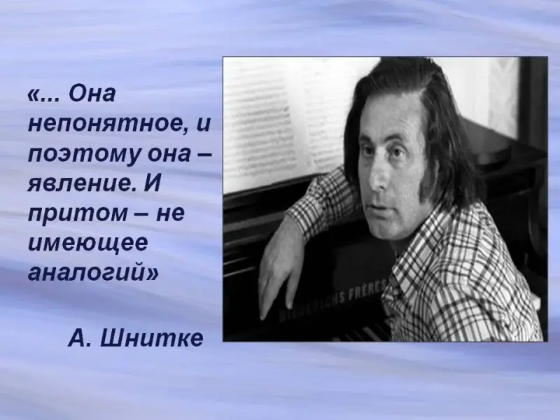 Слайд 3. Близкий друг и соратник Софии Губайдулиной Альфред Шнитке сказал о ней: «Преобладание таинственного - это не только её суть, но и профессиональное качество. Она непонятное, и поэтому она - явление. И притом - не имеющее аналогий».