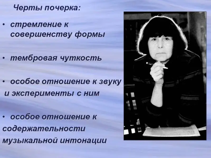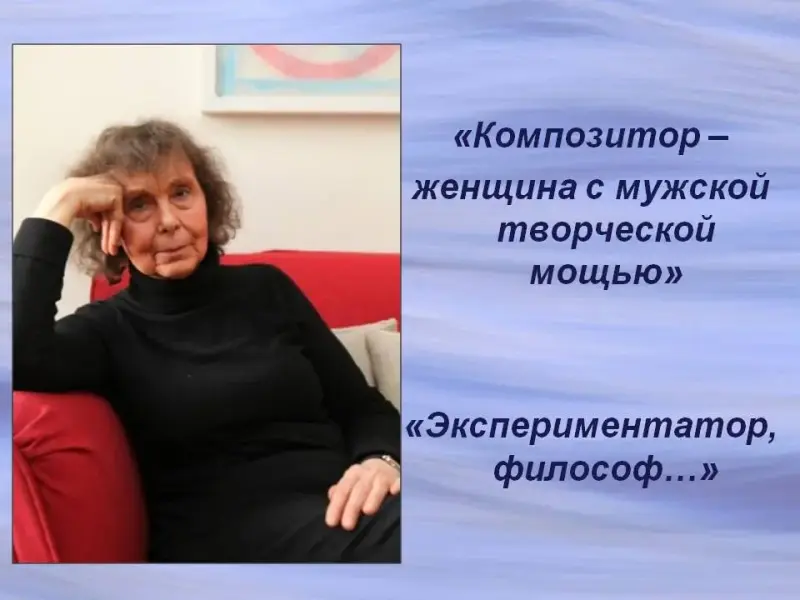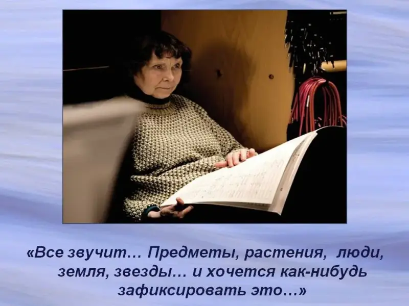 Слайд 2. Её музыка сложна, как непрост наш нынешний мир. Она космична, так как отвлечена от обыденной жизни. Временами её музыка прозрачна и светла, ибо рождена женской душой, тонко чувствующей все оттенки жизни. Композитора привлекают крайности, и потому некоторые свои произведения она так и называет: « Шум и тишина», «Живое и не живое», «Светлое и тёмное».