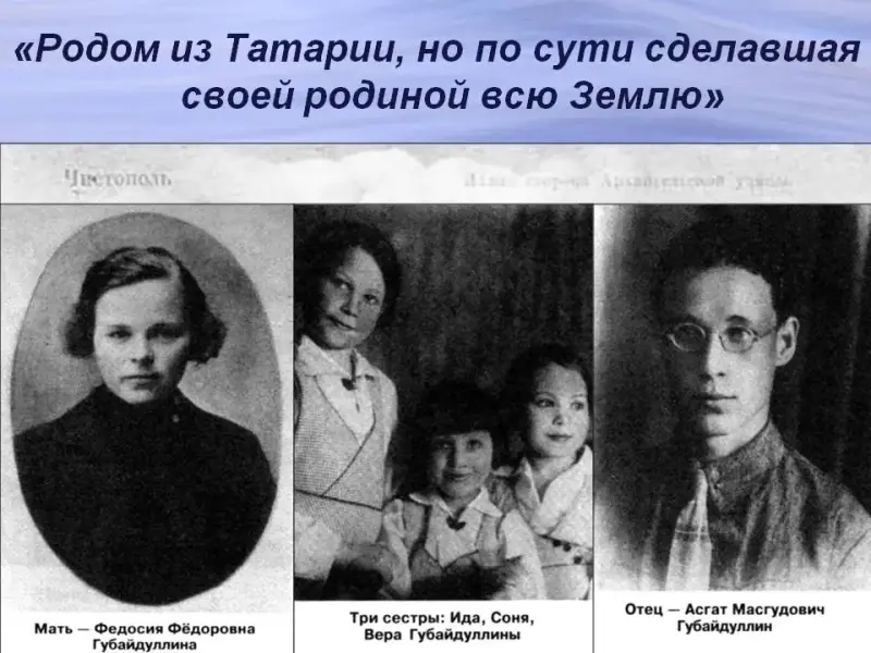Слайд 5. София Асгатовна Губайдулина родилась 24 октября 1931 года в г. Чистополе, в семье молодого инженера-геодезиста Асгата Масгудовича, сына видного татарского муллы, которого прочили на пост муфтия, и учительницы младших классов общеобразовательной школы Елховой Феодосии Фёдоровны. В 1932 году семья переехала в Казань. Отец, как сын муллы, долгое время испытывал притеснения. Воспитание трёх детей целиком лежало на плечах мамы, которая отдавала всю свою энергию и талант, чтобы дать трём дочерям хорошее воспитание и образование.