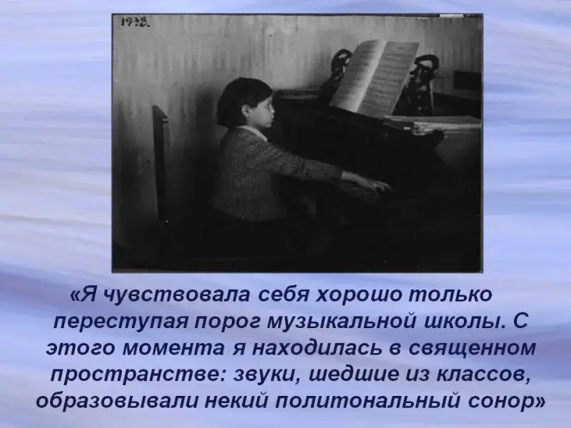Слайд 7-8. В 5 лет Сонечка поступила в музыкальную школу, которую она позднее назвала «храмом детства», куда её постоянно тянуло и влекло. «Я чувствовала себя, хорошо только переступая порог музыкальной школы. С этого момента я находилась в священном пространстве: звуки, шедшие из классов, образовывали некий политональный сонор…». Огромное чувство любви девочка испытывала к первой учительнице музыки Екатерине Павловне Леонтьевой и директору музыкальной школы Рувиму Львовичу Полякову, которого она называла своим «духовным отцом». Эти два человека научили юную ученицу любить Баха, Моцарта, Бетховена. Вскоре начинаются и ее первые настоящие концерты.