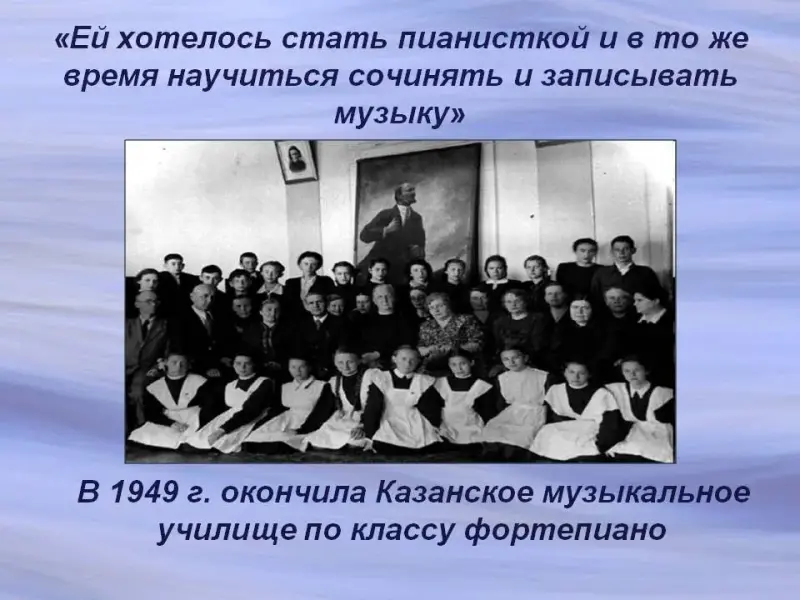 Слайд 9. В 15 лет София поступает в музыкальное училище в класс фортепиано к преподавателю М.А.Пятницкой и факультативно занимается сочинением музыки. В 1949 году оканчивает училище с отличием.