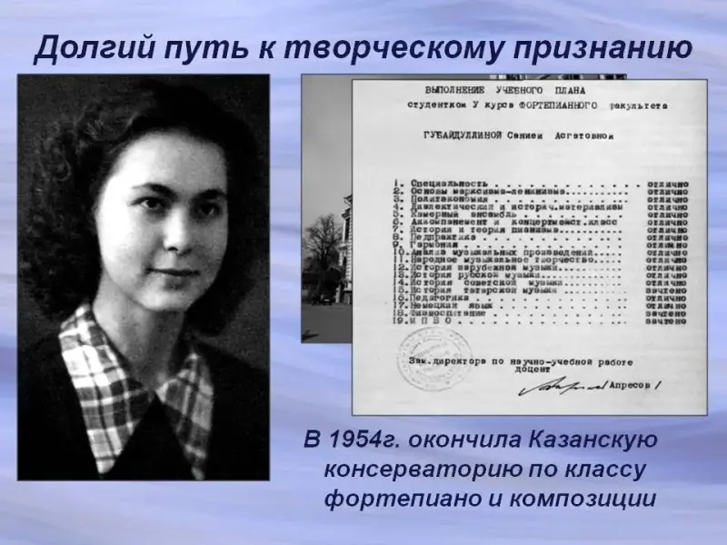 София Губайдулина в 1954 году поступает в Московскую консерваторию на факультет композиции. Ведущими преподавателями-композиторами той поры являлись три профессора: Д. Кабалевский, Ю. Шапорин, А.