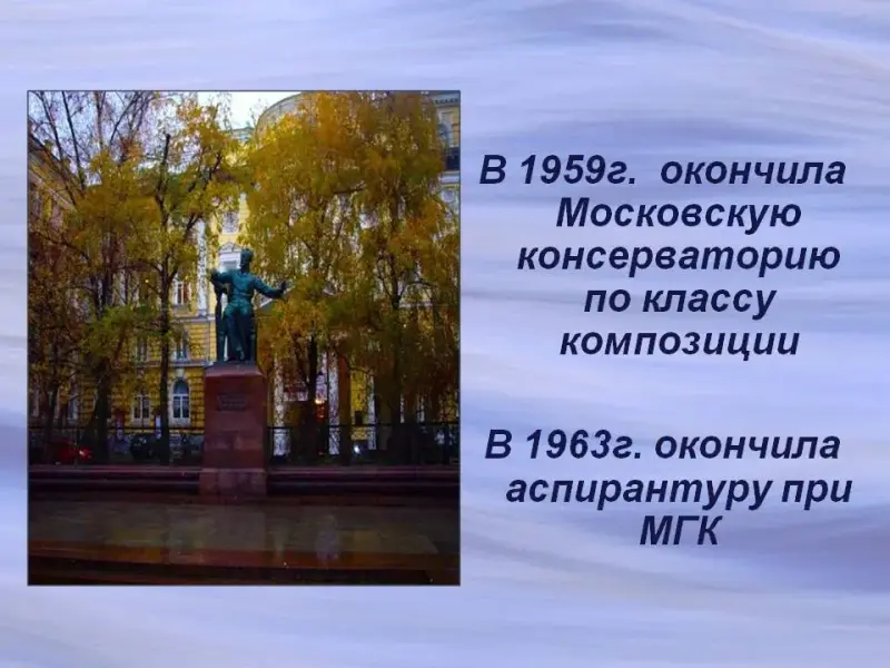 Окончив в 1963 году аспирантуру при Московской консерватории у В. Шебалина и став членом Союза композиторов, она выбрала путь свободного художника. Испытывая материальную нужду, единственным её