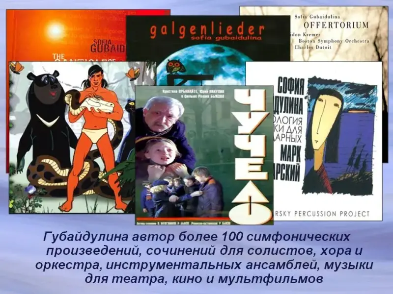 Слайды 15. С. Губайдулина - автор более 100 симфонических произведений, сочинений для солистов, хора и оркестра, инструментальных ансамблей, музыки для театра, кино и мультфильмов. Среди них хорошо известные нам «Чучело», «Маугли», «Человек и его птица». Её обычный образ жизни - непрерывное сочинение с выключенным телефоном.