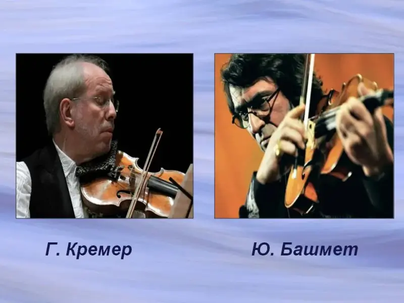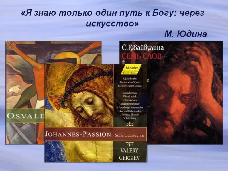 Слайды 29-31. Когда-то при запрещении музыки Губайдулиной, спасением для неё стала поддержка со стороны талантливых отечественных исполнителей, настойчиво включавших ее произведения в свои концертные выступления. Среди исполнителей её музыки были и есть крупнейшие музыканты мира: дирижёры М. Росторопович, Г. Рождественский, В. Гергиев, А. Сладковский, скрипачи О. Каган, Г. Кремер, виолончелисты Вл. Тонха, И. Монигетти, Н. Гутман, Н. Шаховская, альтист Ю. Башмет, фаготист В. Попов, контрабасист А. Суслин, баянисты Ф. Липс, Ю. Шишкин, ударник М. Пекарский.