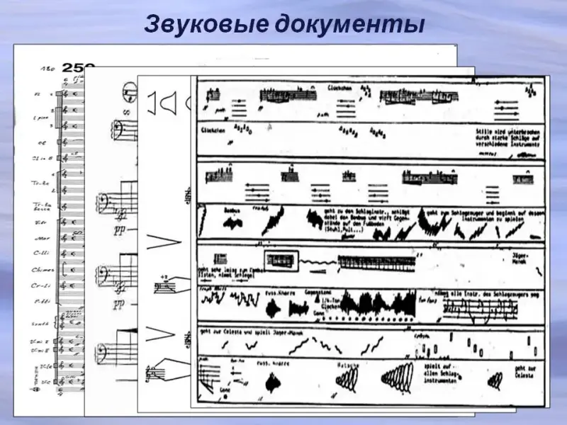 Слайд 24. Новые композиторские техники потребовали создания множества различных символов, фиксирующих эту музыку, поэтому запись современной музыки очень сильно отличается от привычной нотной записи. Её партитуры часто называют звуковыми документами.