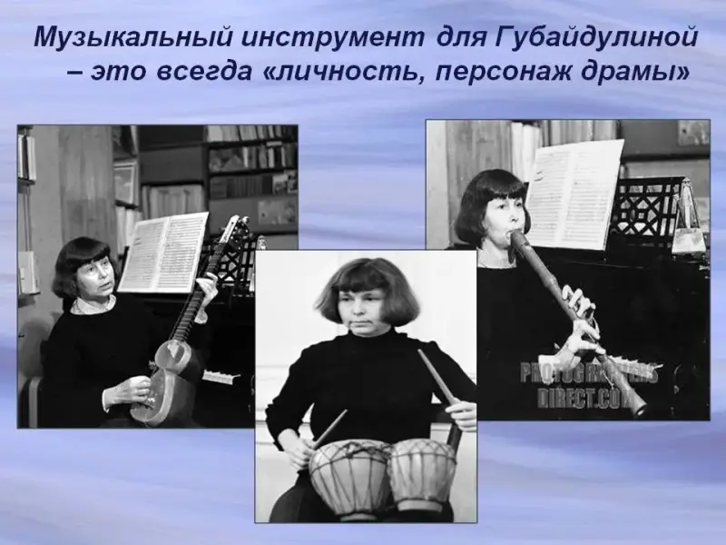 Слайд 25. Музыкальный инструмент для композитора - это всегда «личность, персонаж драмы». Она предпочитает работать с живыми инструментами, дополняя их традиционный состав экзотическими. Композитор говорит, что её привязанность к инструментам сродни привязанности к животным. «Я, помню, купила в Баку тар, привезла его домой и он, сам по себе, всё время звучал, он отзывался, что бы я ни делала. Мне захотелось петь, и он отвечал мне: у него такое тембровое свойство - отвечать. А дальше просто пыталась повторить это своё впечатление и с другими «зверями».