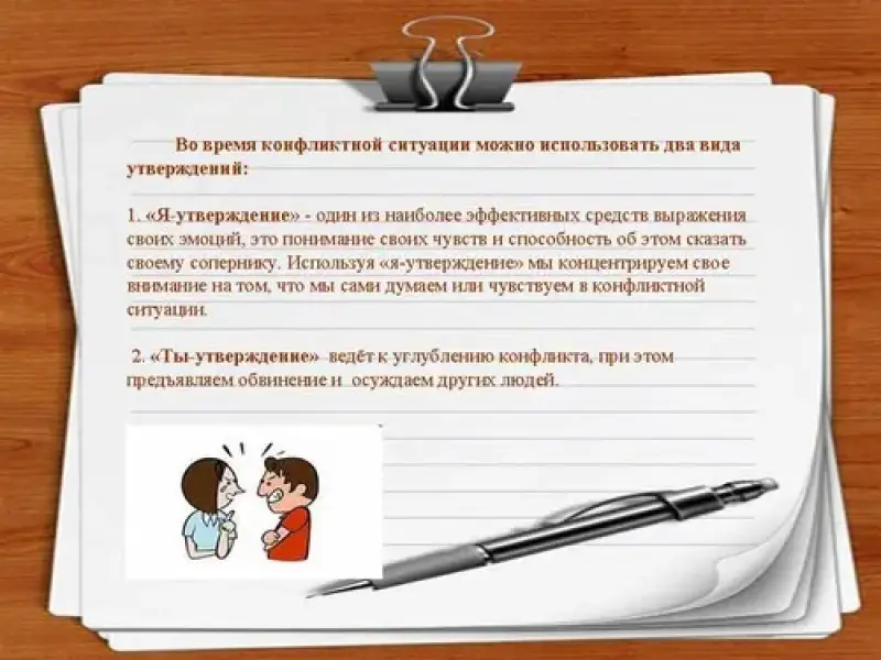 Есть два вида утверждений, которые можно использовать во время конфликтной ситуации. Одним из наиболее эффективных средств выражения своих эмоций, есть понимания своих чувств и способность об этом сказать своему сопернику. Такой способ называется "Я-утверждение". Такое утверждение улучшают взаимоотношения, напротив "Ты-утверждение" подрывают их и ведут к углублению конфликта. Используя "я-утверждение" мы концентрируем свое внимание на том, что мы сами думаем или чувствуем в конфликтной ситуации, при этом мы не предъявляем обвинение и не осуждаем других людей.