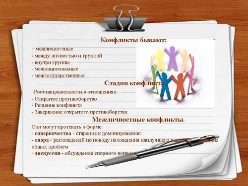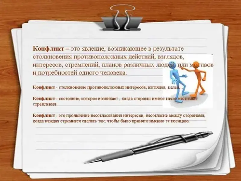 (Слайд №17 ) Конфликт - это явление, возникающее в результате столкновения противоположных действий, взглядов, интересов, стремлений, планов различных людей или мотивов и потребностей одного человека.