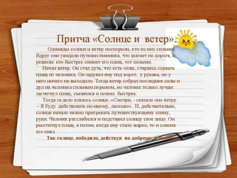 (Слайд №21) Есть такая притча. Однажды солнце и ветер поспорили, кто из них сильнее. Вдруг они увидели путешественника, что шагает по дороге, и решили: кто быстрее снимет его плащ, тот сильнее.