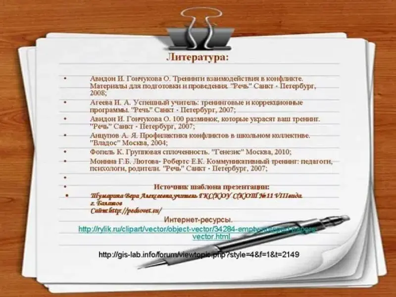 - Анцупов А. Я. Профилактика конфликтов в школьном коллективе. "Владос" Москва, 2004;