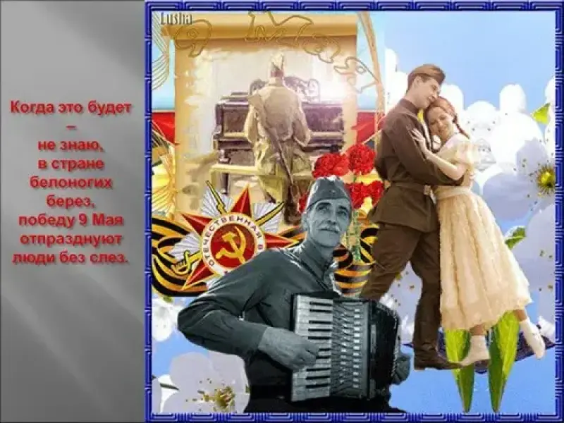 Меня ранило осколком в живот, что даже разглядеть было трудно, что там, потому что смешалось все - и кровь, и рваная гимнастерка, и вмятый туда, в живот, солдатский ремень. Боли почти не было, только все сильнее пекло в животе и хотелось пить. Я заплакала, но слезы потом пропали, они отступили перед тем огромным, что стояло передо мной, в чем нужно было разобраться и к чему следовало подготовиться. Я не жалела себя, своей жизни и молодости, потому что все время думала о том, что было куда важнее, чем я. Мой муж геройски погиб во второй день войны, а сейчас и мне смерть прислала повестку - ржавый и щербатый осколок. Мой сын остался сиротой, он остался один, мой маленький сын в этом огромном и страшном мире. Я думала о том, как переживет он войну, и как потом сложится его жизнь. Я знала, что рана моя смертельна и умирать я буду долго и трудно... Слайд 15.