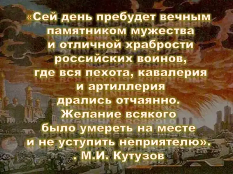 (Слайд 6) "Сей день пребудет вечным памятником мужества и отличной храбрости российских воинов, где вся пехота, кавалерия и артиллерия дрались отчаянно. Желание всякого было умереть на месте и не уступить неприятелю". М.И. Кутузов