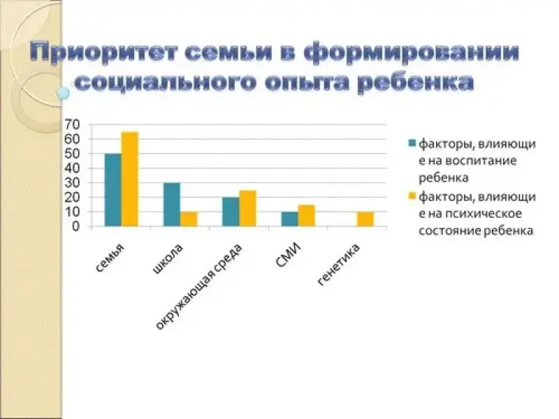 Существует несколько факторов, влияющих на воспитание и психологическое здоровье ребенка. К ним относятся: школа, окружающая среда, средства массовой информации, генетика, ну и конечно же - самый главный фактор - семья.