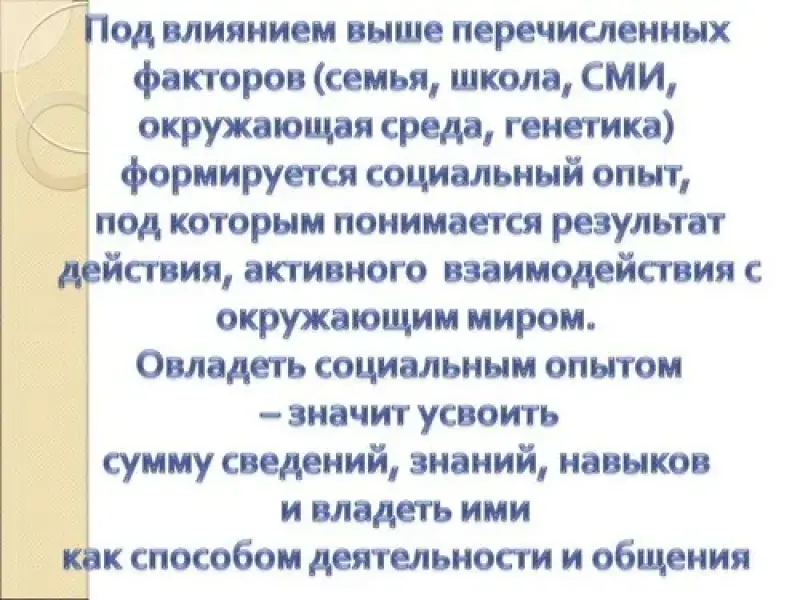 Под влиянием этих факторов и формируется социальный опыт, под которым понимается результат действия, активного взаимодействия с окружающим миром. Овладеть социальным опытом - значит усвоить сумму сведений, знаний, навыков, образцов и владеть ими как способом деятельности и общения. Уважаемые родители, назовите мне, пожалуйста, несколько примеров (положительного) социального опыта, которые передали вам ваши родители? (психологи помогаю родителям, родители называют варианты)