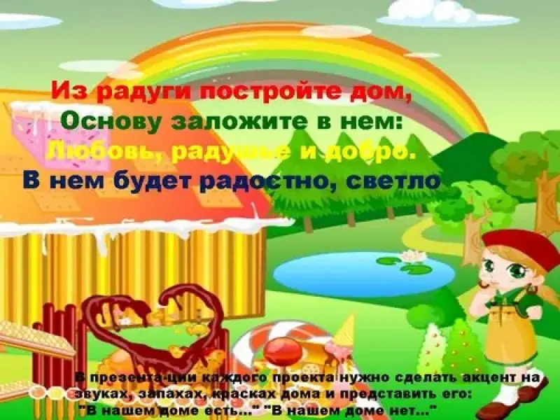После выполнения работы каждая группа представляет презентацию дома. В презентации каждого проекта нужно сделать акцент на звуках, запахах, красках дома и представить его: "В нашем доме есть..." "В нашем доме нет..."