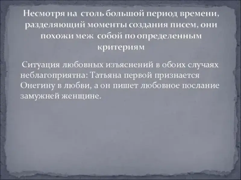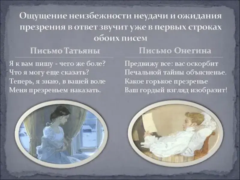 Если попытаться сопоставить письма Татьяны и Онегина, то можно выявить определенные сходства в них. Оба героя изначально бросают вызов моральным нормам, ведь Татьяна в своем письме первой признается мужчине в чувствах, а Онегин пишет о своей любви замужней женщине.